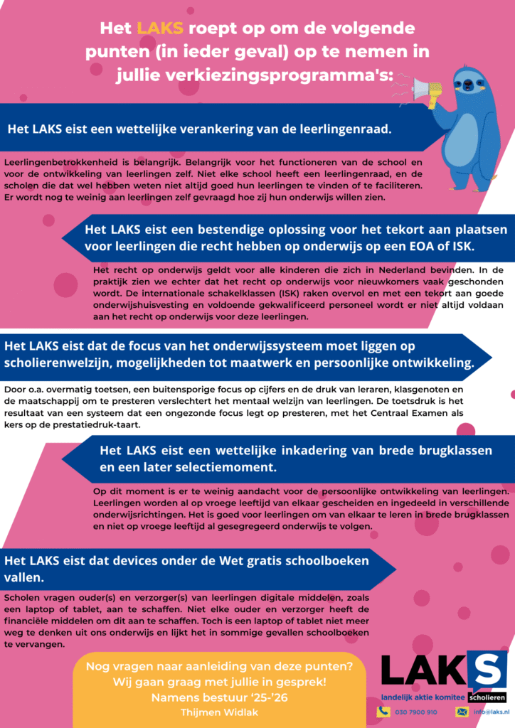 In oktober vinden de landelijke verkiezingen plaats. In het kader daarvan pleit het LAKS voor bovenstaande punten.